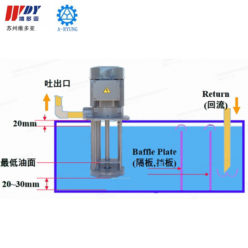 浸水式泵的吸入口在 Pump 的下方,所以要使 Pump的底面與Tank的地面距離要維持在 (約 20~30mm)。如果與水池地面距離太近,可能使切削物等雜質(zhì)混入造成泵的性能降低,這也是導(dǎo)致故障發(fā)生的原因之一。